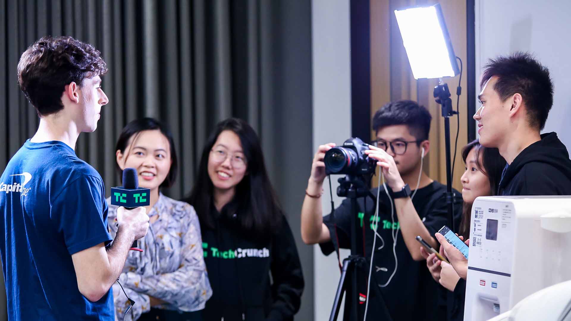 “哈哈又碰头了,身边的女 partner 换了哟。“黄浩洋看见在香港黑客马拉松打过照面的视频记者恶作剧地打招待。