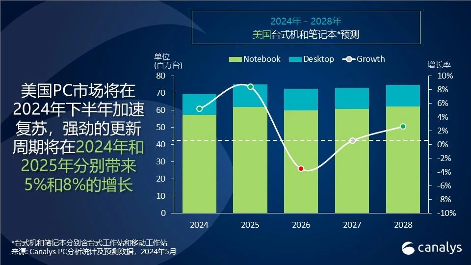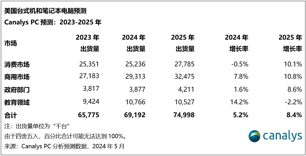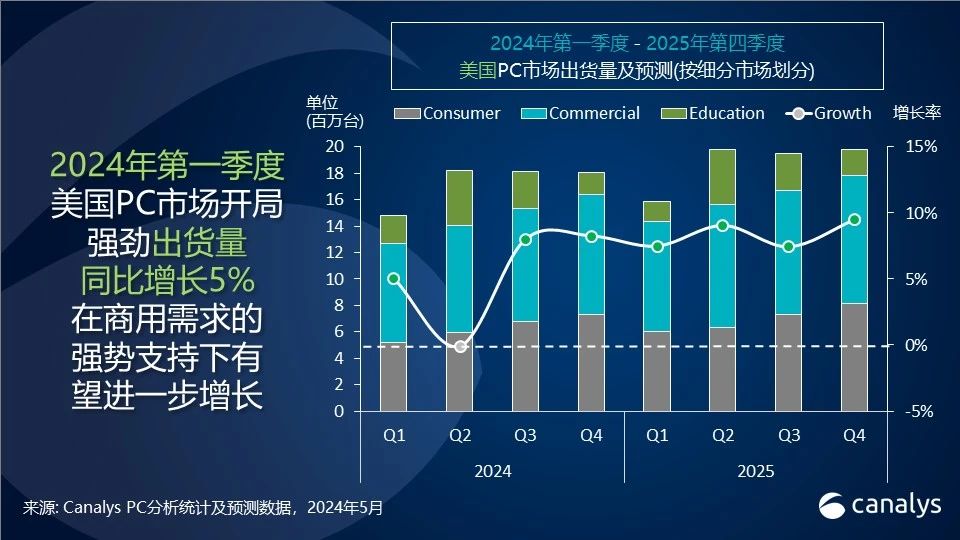 Canalys猜测,到2024年末,美国PC商场将坚持微弱气势,到2025年将更上一层楼。2024年,美国PC出货量将增加5%,2025年将再增加8%。