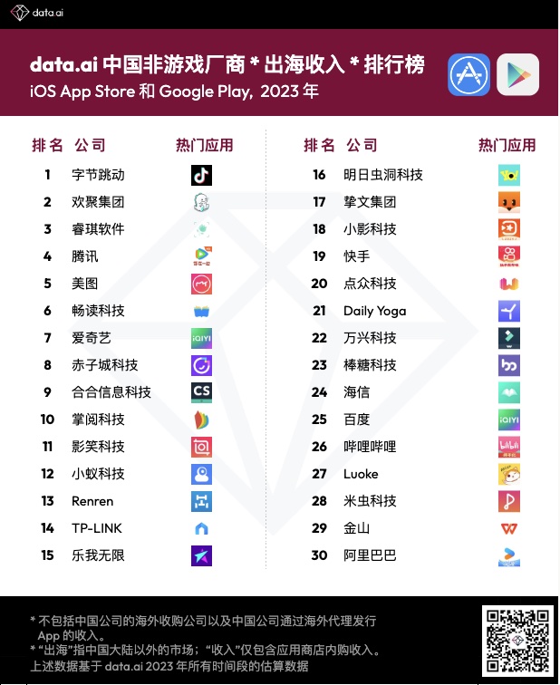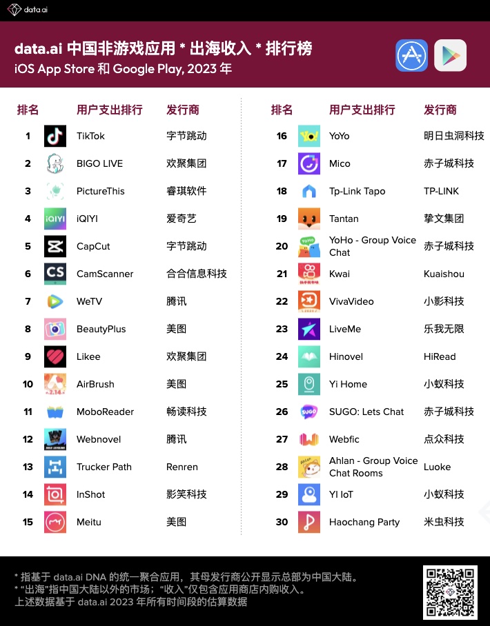 data.ai 发布了 2023 年我国使用厂商及使用出海收入 30 强榜单,以下是详细内容: