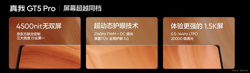 真我GT5 Pro与京东方联合定制并首发无双屏,不只完成职业最高峰值亮度4500nit,还职业初次完成手动最高亮度1000nit、大局最高亮度1600nit,做到了三大亮度职业榜首。屏幕的极限亮度代表的是屏幕技能的上限,而真我GT5 Pro则将屏幕亮度体会上限全面拉高!