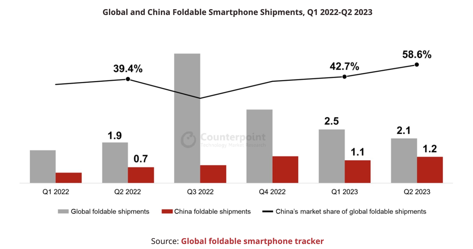 - 尽管2023年第二季度全球智能手机总出货量有所下降,但全球折叠屏手机出货量却逆势增加;