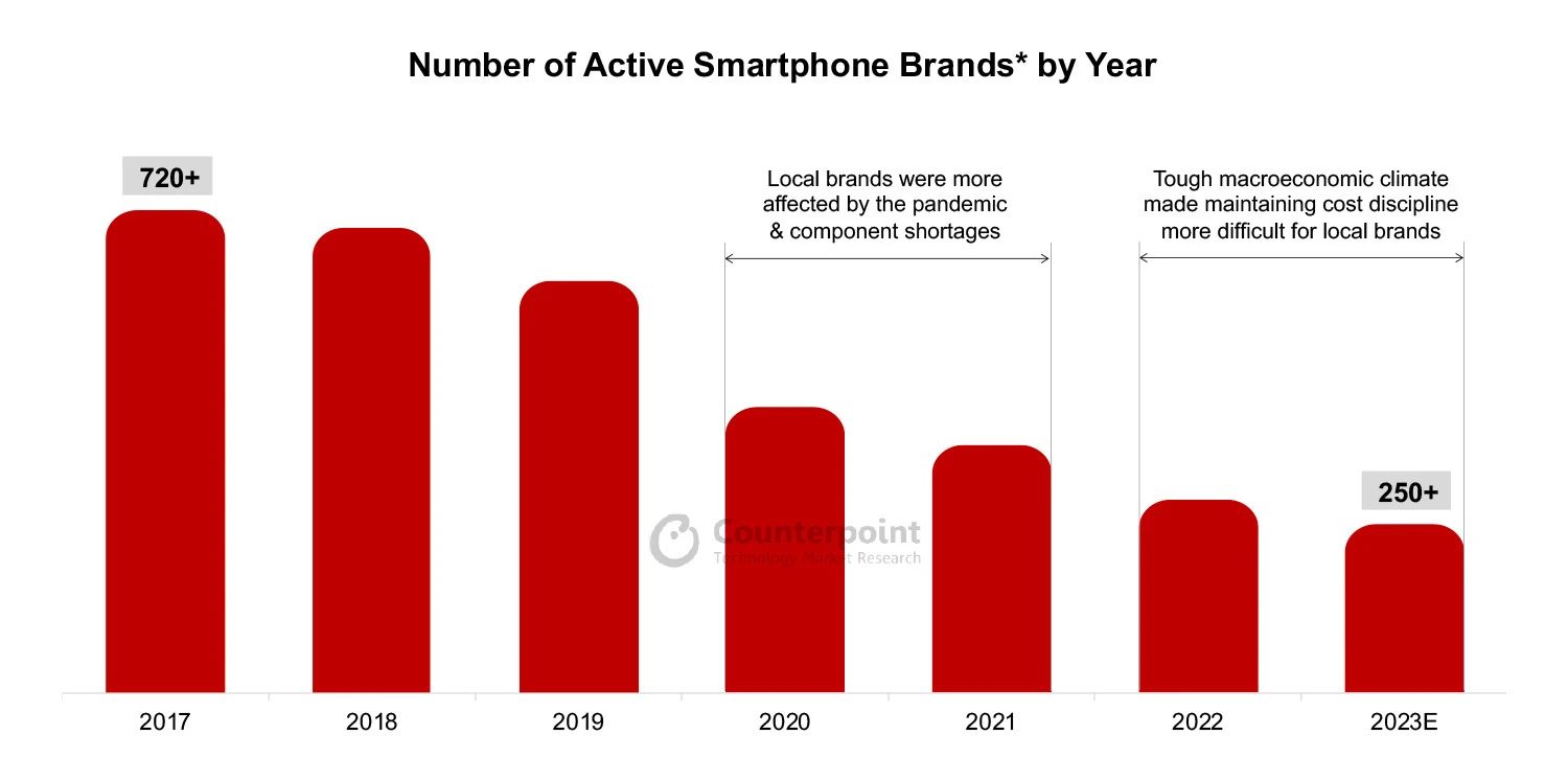在2017年鼎盛时期,全球智能手机商场竞争剧烈,700多个品牌互争雄长。时至2023年,依据监控活泼品牌(记载有销量的品牌)在70多个首要国家销量的Counterpoint全球机型销量追寻,其数量已削减三分之二至近250个。