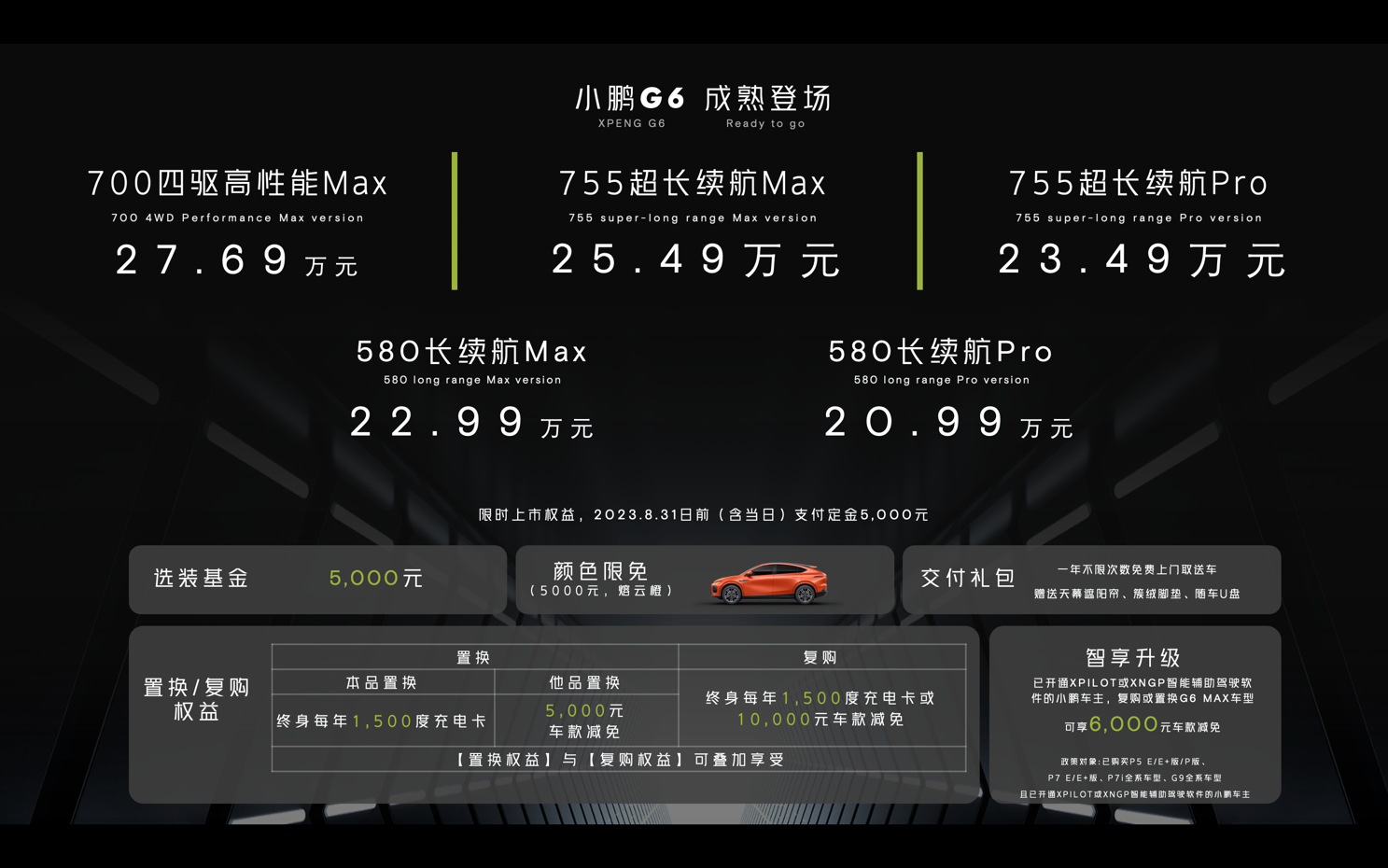 引领下一代智能电动轿车规范的超智驾轿跑SUV—小鹏G6正式上市。新车共推出5个版别,价格区间为20.99万元-27.69万元,小鹏G6将完成上市即交给,Max版车型的XNGP高阶智能辅佐驾驭才能也随交给立刻完成。在叠加预售权益的基础上,榜首批用户还将在上市期内取得5000元选装基金、熔云橙外观色限时免费(价值5000元)、交给礼包、复购/置换权益、智享晋级(福利,供给给已注册XPILOT/XNGP智能辅佐驾驭体系软件的小鹏车主,用于复购或置换G6 Max车型)等多重尊享权益。